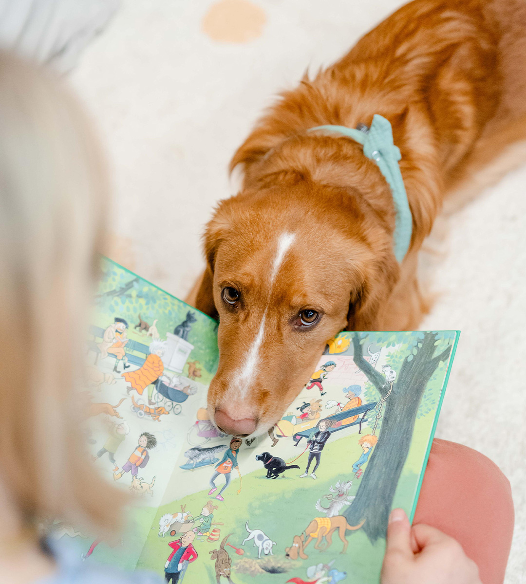 Mein Name ist Fiete! Ich bin ein Golden Retriever und seit meiner Welpenzeit fester Bestandteil der Praxis. Mit meiner offenen und freundlichen Art begeistere ich Groß und Klein. In den Therapien sorge ich für eine extra Portion Motivation, Freude und Leichtigkeit. Ich schaffe eine besondere Atmosphäre, die den Zugang zu den Übungen erleichtert und das Lernen unterstützt. Auch Studien zeigen, dass Tiere die Kommunikationsbereitschaft steigern und Lernprozesse fördern können. Mit mir wird jede Therapieeinheit ein bisschen leichter, bunter und fröhlicher.